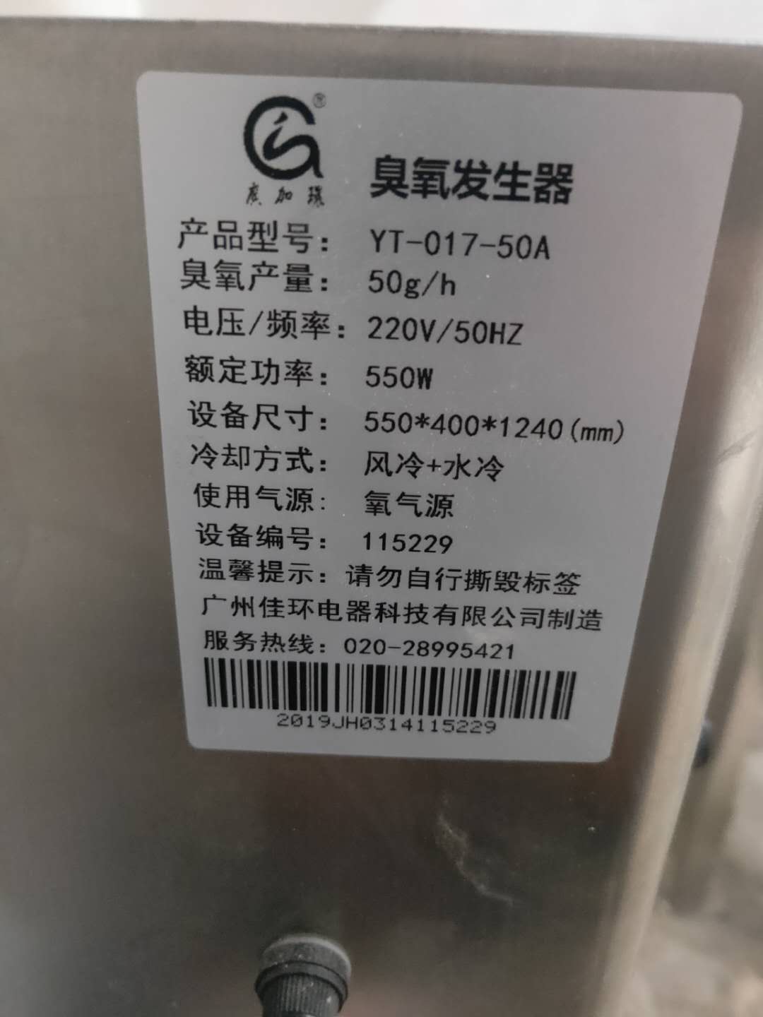 型號:采用50g氧氣源臭氧設備一臺AyR臭氧發生器_臭氧消毒機_臭氧水機_制氧機_廣州佳環電器【官網】